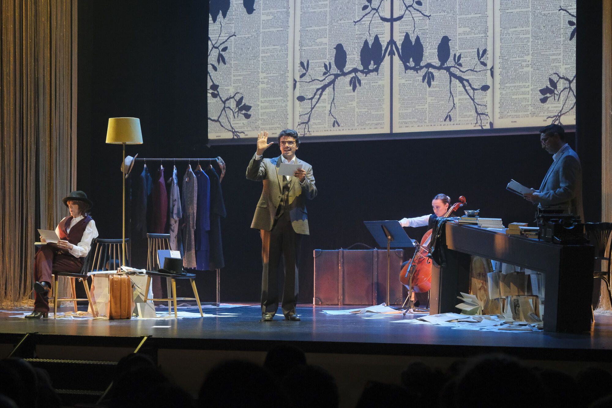 Una maleta llena de libros, montañas de periódicos y algunas lámparas son elementos de un espacio escénico habitado por tres actores y una chelista.